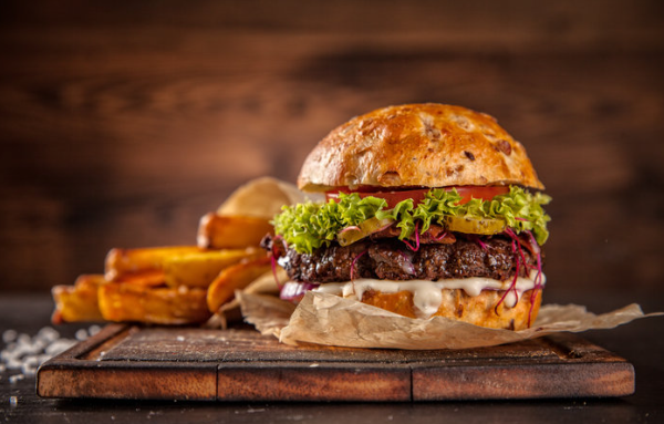 224g täyslihapihvi, cheddarjuusto, pekoni, jääsalaatti, punasipuli, kurkku, tuore tomaatti, talon majoneesi ja kurkkumajoneesi